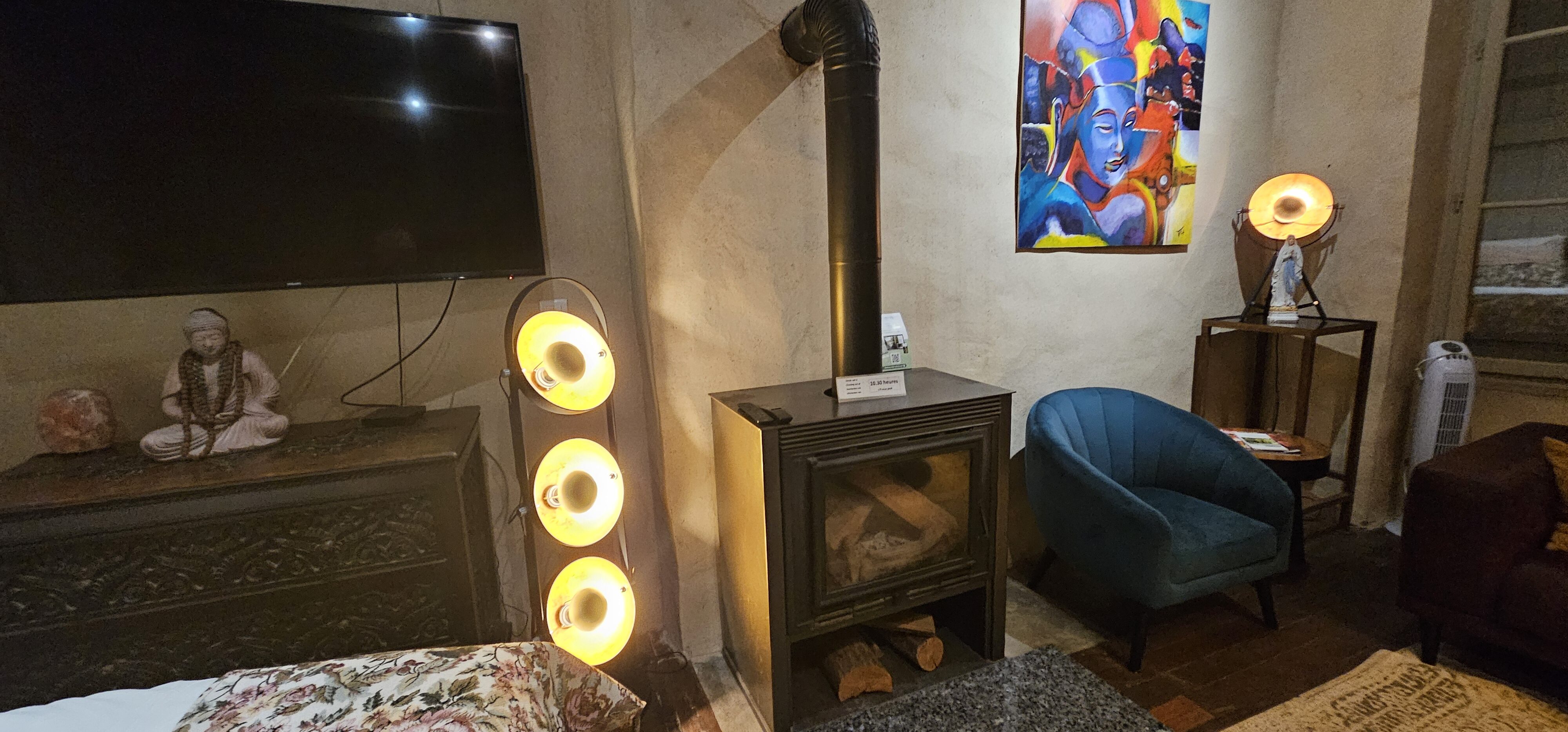 The room is very spacious with its 48m2 and has a cozy wood stove and atmospheric lighting. The room has an ensuite bathroom with shower, toilet and sink.